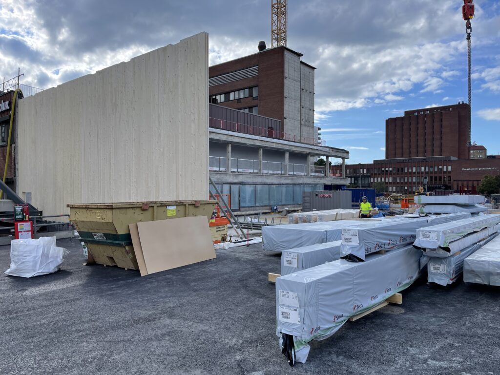 What is happening on the construction site? This week work began on erecting the frame. We start with the part of the office that is located under brf Gourmet. We will gradually work our way north, and next in turn is the 9-storey office extension and the low-rise part closest to Kellgrensgatan. Assembly of the frame is planned to last until next spring, March 2024.